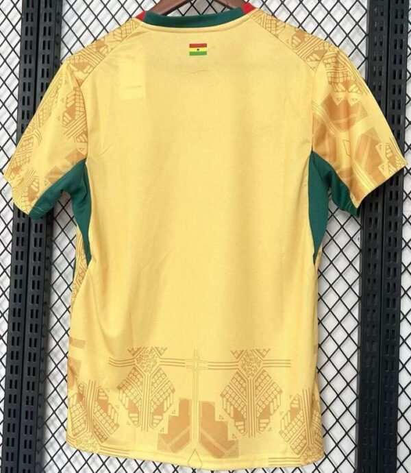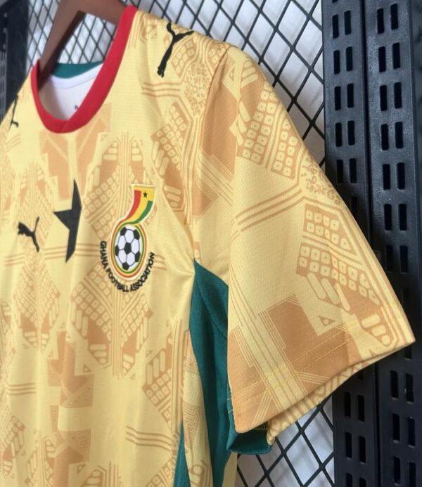 Away Jersey (Yellow): A vibrant “Gold Coast” yellow featuring tonal geometric patterns that pay homage to traditional Kente weaving. The green side panels and red collar complete the national colors, ensuring the Black Stars stand out under the stadium lights of the USA.