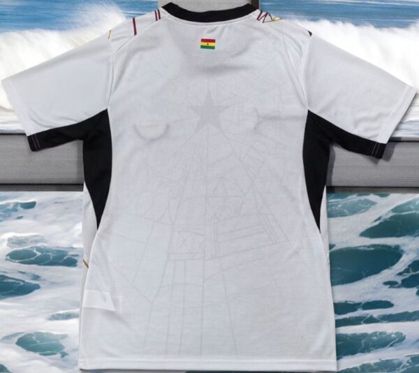 Home Jersey (White): The iconic white base is transformed with a bold, multidimensional “Spiderweb” or “Adinkra” inspired graphic, radiating from the central Black Star. This intricate line work symbolizes the interconnectedness of the Ghanaian people and their global diaspora.