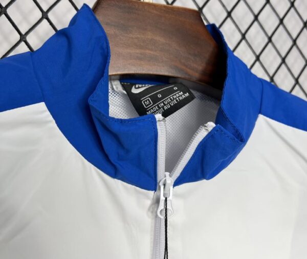 This elegant blue and white tracksuit jacket was worn by the legendary Brazilian national team — led by Ronaldo, Rivaldo, Cafu, and Roberto Carlos — during their unforgettable journey to the 1998 World Cup Final at the Stade de France in Paris.