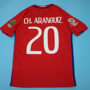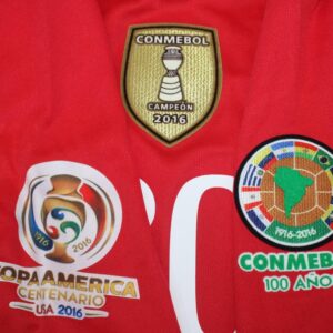 This striking red home jersey represents Chile’s rise to football greatness, crowned by their dramatic victory over Messi’s Argentina in the final.