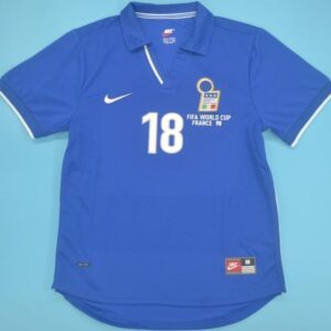Own the classic Italy National Team 1998 World Cup Jersey (Replica). Honors Roberto Baggio’s final WC and features stars like Maldini and Cannavaro. Blue Polyester kit. FREE Worldwide Shipping to Italy and global fans.