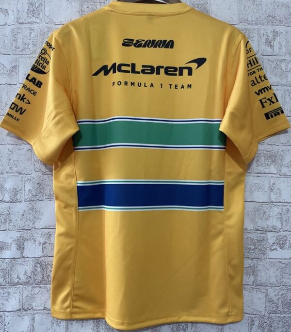 Inspired by Ayrton Senna’s legendary Brazilian colors, this striking yellow tee with green and blue chest stripes pays tribute to his unforgettable career with McLaren.
