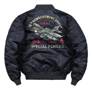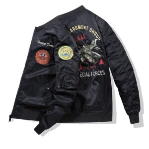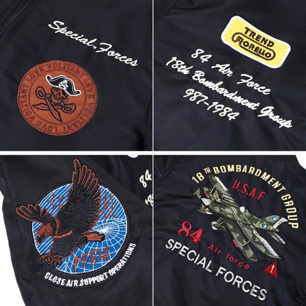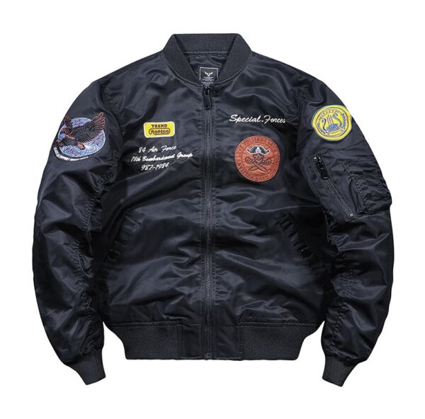 | Unique Embroidery | Detailed flying bird appliqué for a distinctive, collectible look. | Embroidered Bomber Jacket, Unique Patches, Custom Design |