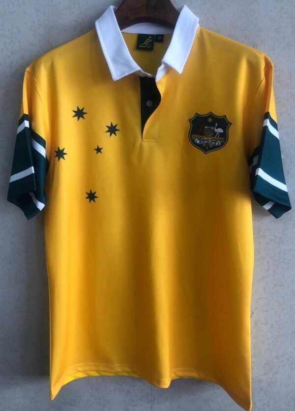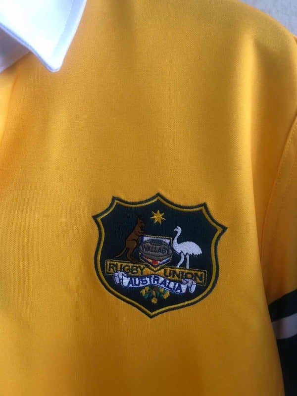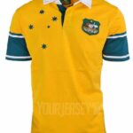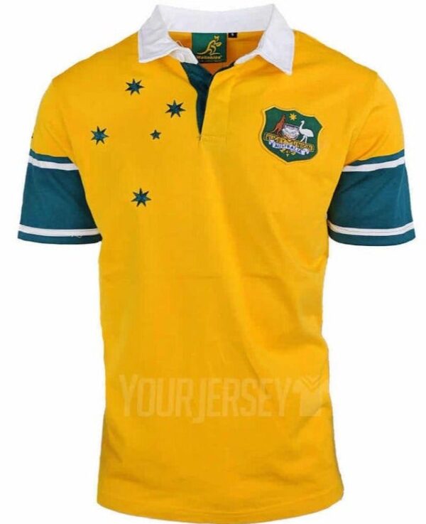 Here is the retro jersey of the Australian national rugby team during the 1999 world cup played in the United Kingdom. The Australian wallabies won their second world cup in their history by beating the French team in the final in Cardiff (35-12).