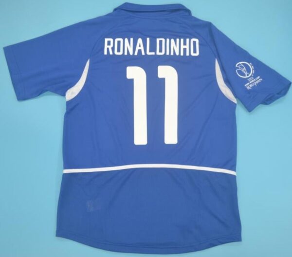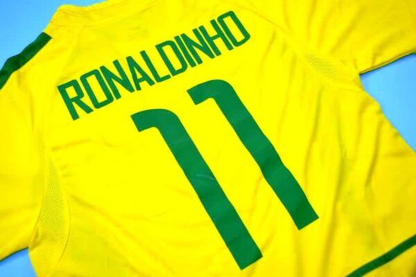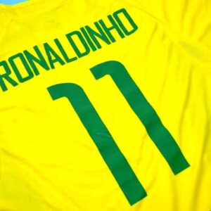 Step back into football history with this legendary yellow jersey worn by Ronaldinho, Ronaldo, Rivaldo, and Cafu during Brazil’s unforgettable triumph in Japan and South Korea.