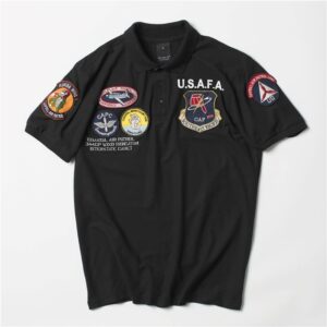 | Design | US Air Force / Top Gun inspired aesthetic with multiple military logos/patches. | Embroidered Polo Shirt, Military Patches, Air Force Apparel |