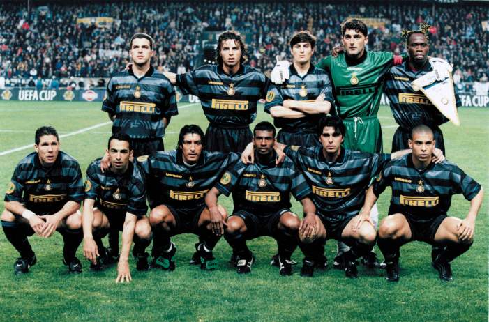 The early 90s brought a kit many fans still cherish: Umbro’s dark-hued, almost oil-slicked take on the Nerazzurri stripes, worn during Inter’s successful Cup Winners’ Cup campaign.